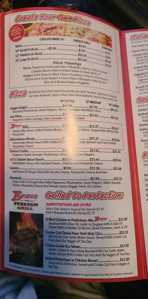 Bravo Italian Grill offers an extensive menu that showcases a mix of Italian classics and American favorites. Guests can find delectable pasta options, including meat sauce and creamy garlic dishes. The restaurant also features pizzas, with customization available to suit various preferences. For those sharing meals, small plates are available, encouraging a sociable dining approach.