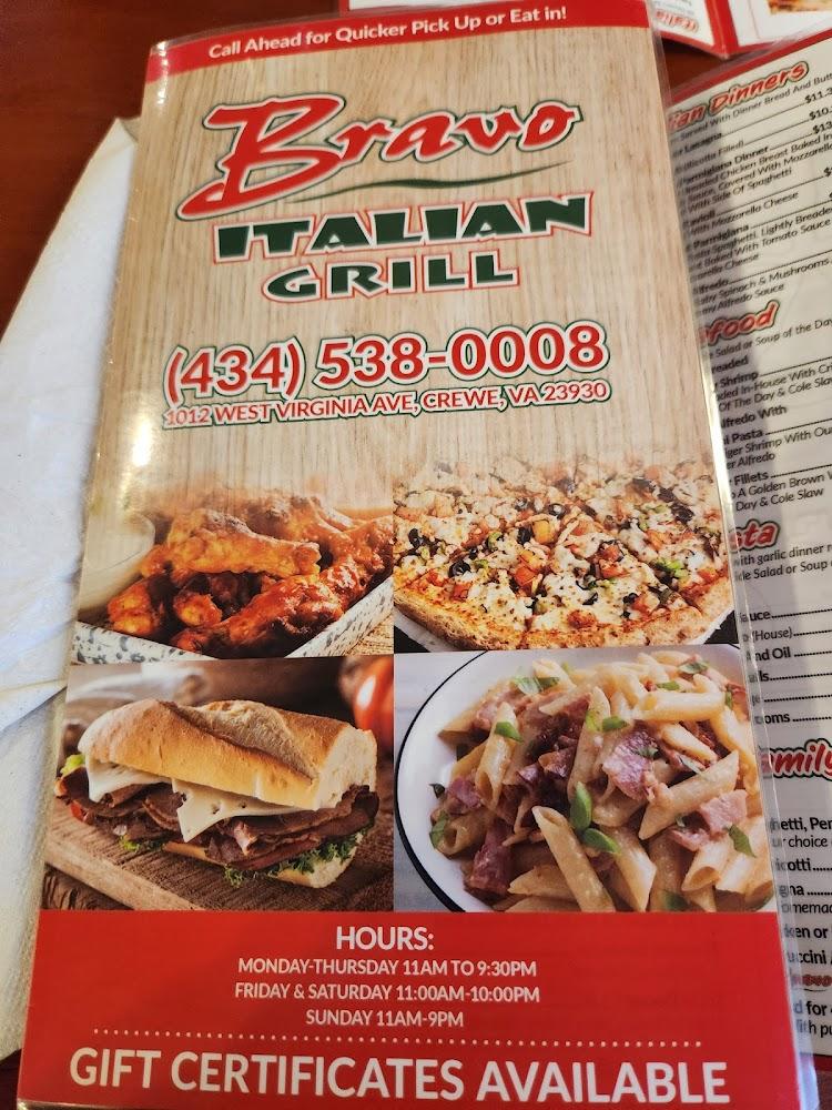 Welcome to Bravo Italian Grill, located at 1012 W Virginia Ave in Crewe, VA. Our cozy restaurant offers a delightful range of authentic Italian dishes, from delicious pizzas to traditional meals, all at prices ranging from $10 to $20. Enjoy a relaxed dining experience with fast service while sipping on our extensive wine selection. We cater to all with accessible seating and amenities, making it family-friendly. Whether you're here for lunch, dinner, or a quick takeout, our menu accommodates vegetarians and offers healthy options. Come and experience the warm ambiance that makes Bravo a local favorite!